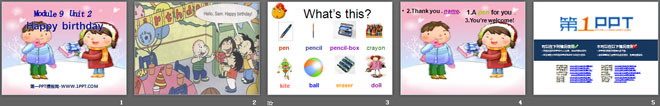 关键词:《Happy birthday!》教学课件,外研版一起点一年级上册英语课件,一年级英语幻灯片课件下载,《Happy birthday!》PPT课件下载,.ppt格式