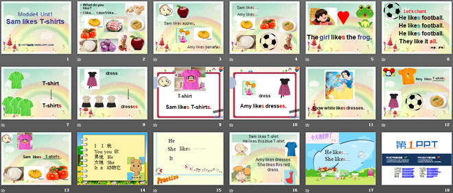 关键词:《Sam like T-shirts》教学课件,外研版一起点二年级上册英语课件,二年级英语幻灯片课件下载,《Sam like T-shirts》PPT课件下载,.ppt格式