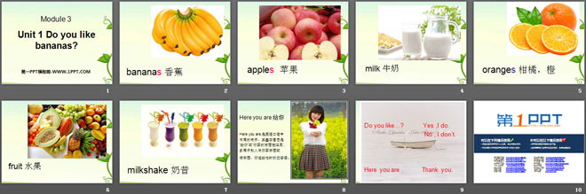 关键词:《Do you like bananas?》教学课件,外研版一起点二年级上册英语课件,二年级英语幻灯片课件下载,《Do you like bananas?》PPT课件下载,.ppt格式