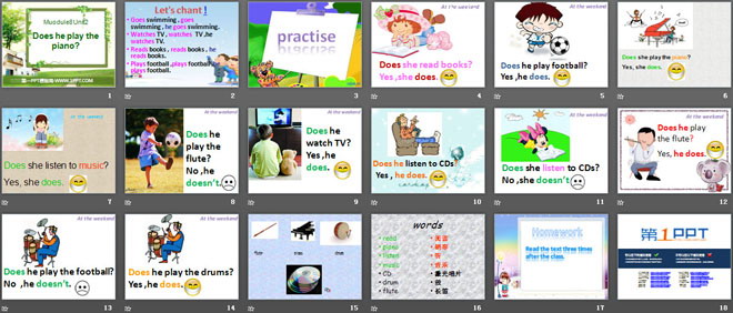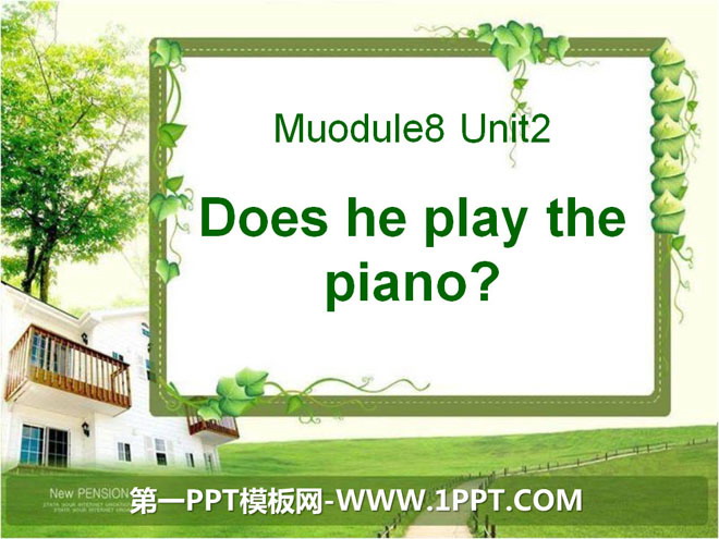 关键词:《Does he play the piano?》教学课件,外研版一起点二年级上册英语课件,二年级英语幻灯片课件下载,《Does he play the piano?》PPT课件下载,.ppt格式
