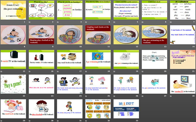 关键词:《She goes swimming》教学课件,外研版一起点二年级上册英语课件,二年级英语幻灯片课件下载,《She goes swimming》PPT课件下载,.ppt格式