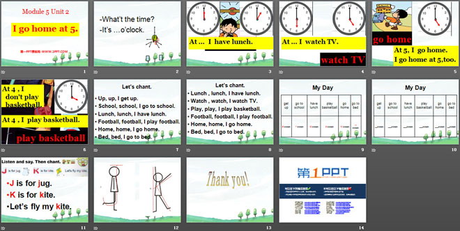 关键词:《I go home at 5》教学课件,外研版一起点二年级上册英语课件,二年级英语幻灯片课件下载,《I go home at 5》PPT课件下载,.ppt格式