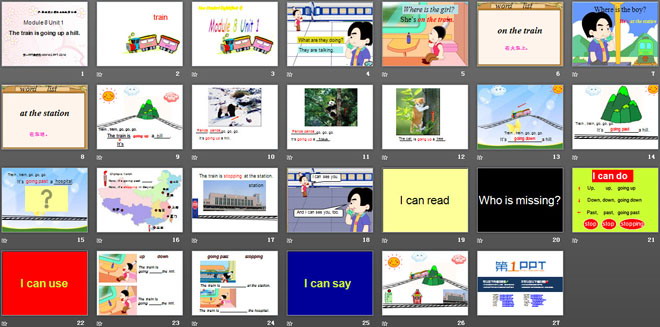 关键词:《The train is going up a hill》教学课件,外研版一起点二年级下册英语课件,二年级英语幻灯片课件下载,《The train is going up a hill》PPT课件下载,.ppt格式