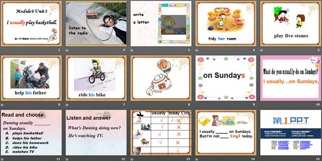 关键词:《I usually play basketball》教学课件,外研版一起点二年级下册英语课件,二年级英语幻灯片课件下载,《I usually play basketball》PPT课件下载,.ppt格式