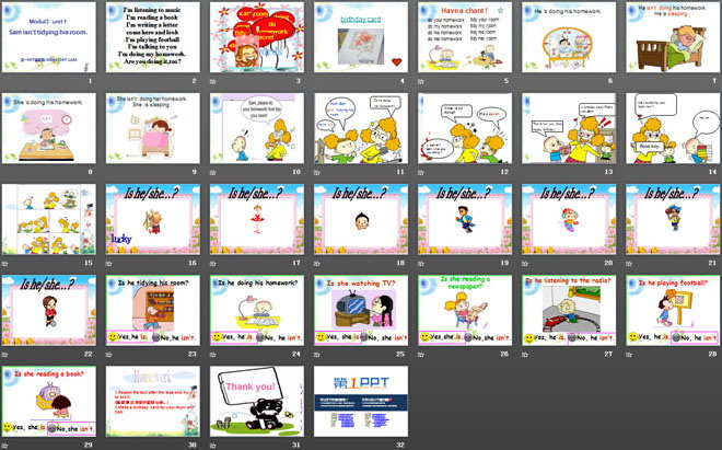 关键词:《Sam isn't tidying his room》教学课件,外研版一起点二年级下册英语课件,二年级英语幻灯片课件下载,《Sam isn't tidying his room》PPT课件下载,.ppt格式