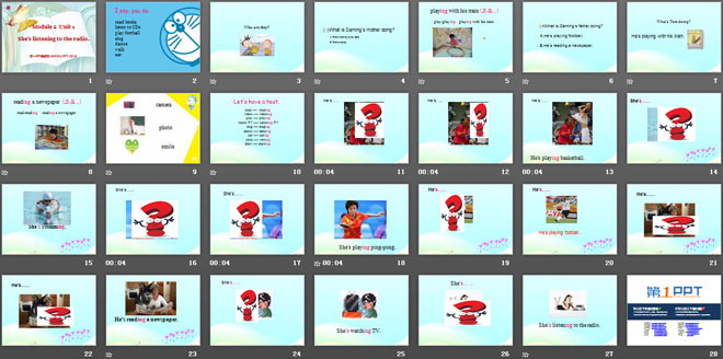 关键词:《She's listening to the radio》教学课件,外研版一起点二年级下册英语课件,二年级英语幻灯片课件下载,《She's listening to the radio》PPT课件下载,.ppt格式
