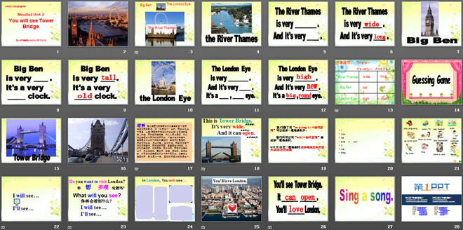 关键词:《You'll see Tower Bridge》教学课件,外研版一起点三年级下册英语课件,三年级英语幻灯片课件下载,《You'll see Tower Bridge》PPT课件下载,.ppt格式