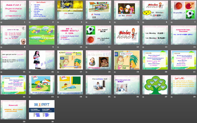 关键词:《She goes to school on Mondays》教学课件,外研版三起点三年级下册英语课件,三年级英语幻灯片课件下载,《She goes to school on Mondays》PPT课件下载,.ppt格式