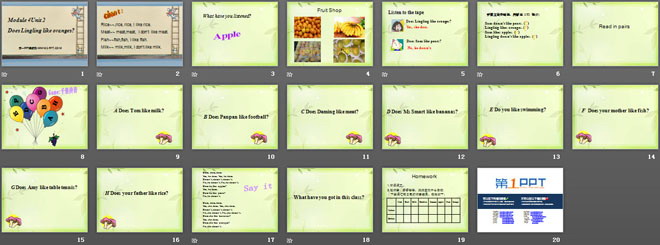 关键词:《Does Lingling like oranges?》教学课件,外研版三起点三年级下册英语课件,三年级英语幻灯片课件下载,《Does Lingling like oranges?》PPT课件下载,.ppt格式