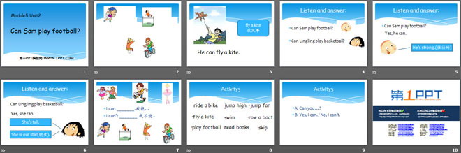 关键词:《Can Sam play football?》教学课件,外研版三起点四年级上册英语课件,四年级英语幻灯片课件下载,《Can Sam play football?》PPT课件下载,.ppt格式