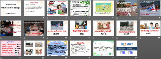 关键词:《What are they doing?》教学课件,外研版三起点四年级上册英语课件,四年级英语幻灯片课件下载,《What are they doing?》PPT课件下载,.ppt格式