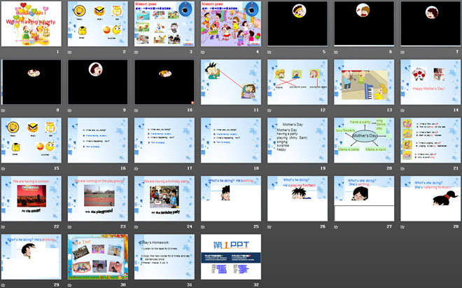关键词:《We're having a party》教学课件,外研版一起点四年级下册英语课件,四年级英语幻灯片课件下载,《We're having a party》PPT课件下载,.ppt格式