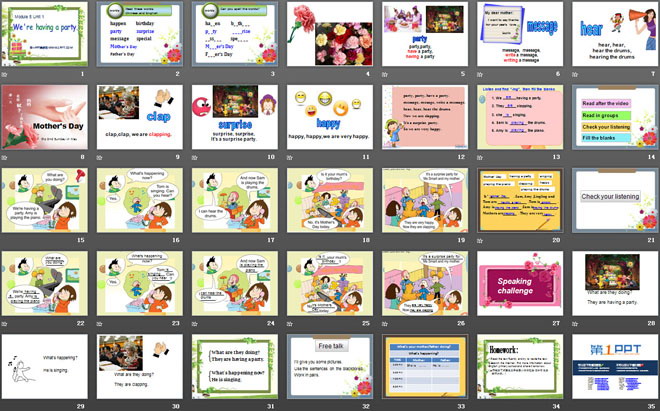 关键词:《We're having a party》教学课件,外研版一起点四年级下册英语课件,四年级英语幻灯片课件下载,《We're having a party》PPT课件下载,.ppt格式