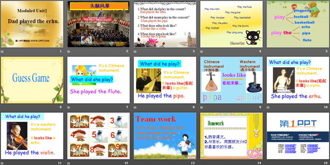 关键词:《Dad played the erhu》教学课件,外研版一起点四年级下册英语课件,四年级英语幻灯片课件下载,《Dad played the erhu》PPT课件下载,.ppt格式