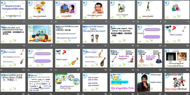 关键词:《Dad played the erhu》教学课件,外研版一起点四年级下册英语课件,四年级英语幻灯片课件下载,《Dad played the erhu》PPT课件下载,.ppt格式