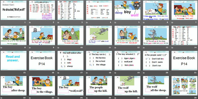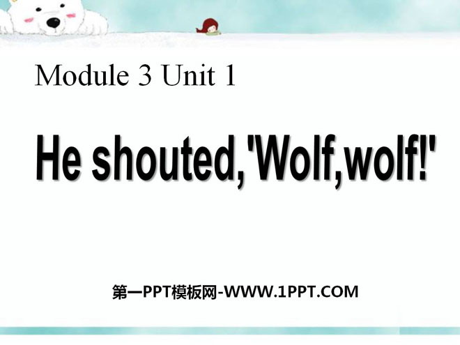 关键词:《He shouted,'Wolf,wolf!'》教学课件,外研版一起点四年级下册英语课件,四年级英语幻灯片课件下载,《He shouted,'Wolf,wolf!'》PPT课件下载,.ppt格式