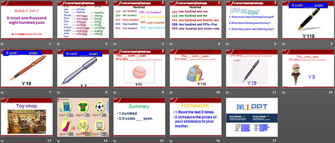 关键词:《It costs one thousand eight hundred yuan》教学课件,外研版一起点四年级下册英语课件,四年级英语幻灯片课件下载,《It costs one thousand eight hundred yuan》PPT课件下载,.ppt格式