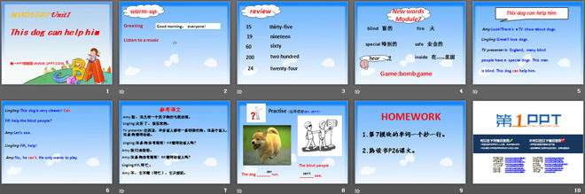 关键词:《This dog can help him》教学课件,外研版一起点五年级上册英语课件,五年级英语幻灯片课件下载,《This dog can help him》PPT课件下载,.ppt格式