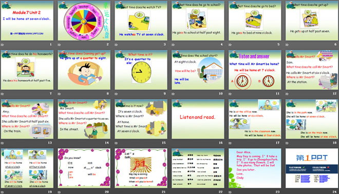 关键词:《I will be home at 7 o'clock》教学课件,外研版一起点五年级下册英语课件,五年级英语幻灯片课件下载,《I will be home at 7 o'clock》PPT课件下载,.ppt格式