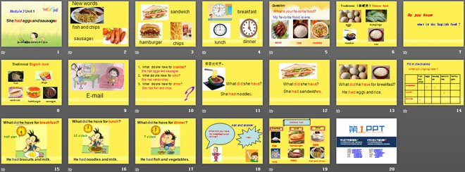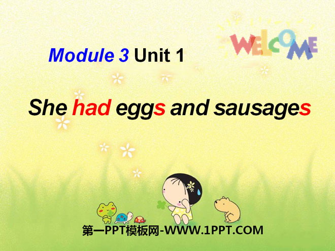 关键词:《She had eggs and sausages》教学课件,外研版三起点五年级下册英语课件,五年级英语幻灯片课件下载,《She had eggs and sausages》PPT课件下载,.ppt格式