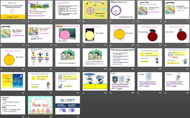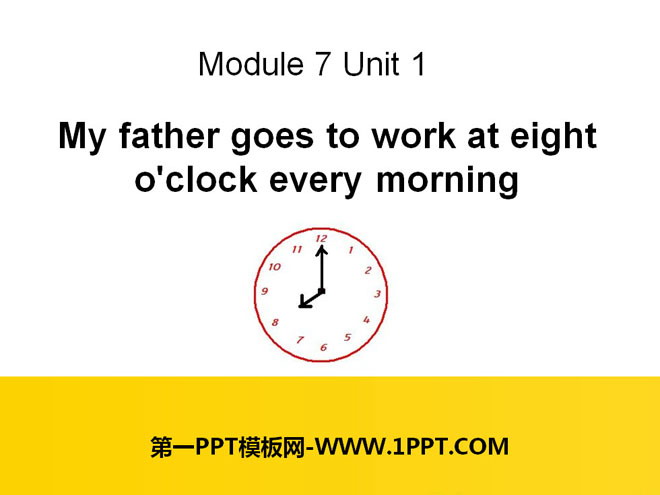 关键词:《My father goes to work at eight o'clock every morning》教学课件,外研版三起点五年级下册英语课件,五年级英语幻灯片课件下载,《My father goes to work at eight o'clock every morning》PPT课件下载,.ppt格式