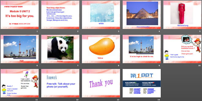 关键词:《It's too big for you》教学课件,外研版三起点五年级下册英语课件,五年级英语幻灯片课件下载,《It's too big for you》PPT课件下载,.ppt格式
