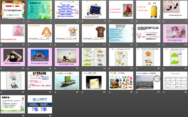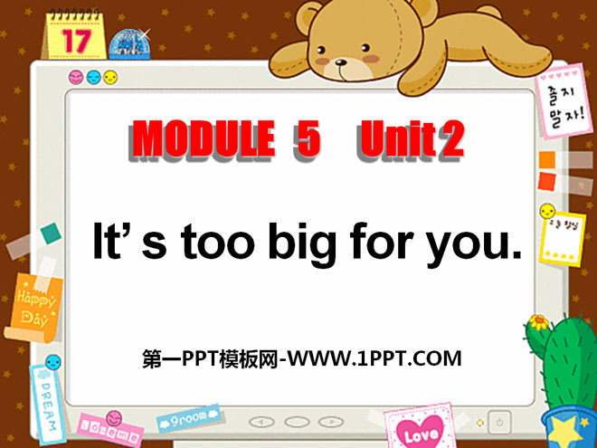 关键词:《It's too big for you》教学课件,外研版三起点五年级下册英语课件,五年级英语幻灯片课件下载,《It's too big for you》PPT课件下载,.ppt格式
