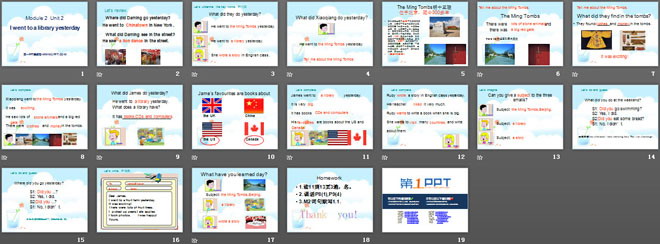 关键词:《I went to a library yesterday》教学课件,外研版一起点六年级上册英语课件,六年级英语幻灯片课件下载,《I went to a library yesterday》PPT课件下载,.ppt格式