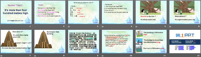 关键词:《It's more than four hundred metres high》教学课件,外研版一起点六年级上册英语课件,六年级英语幻灯片课件下载,《It's more than four hundred metres high》PPT课件下载,.ppt格式