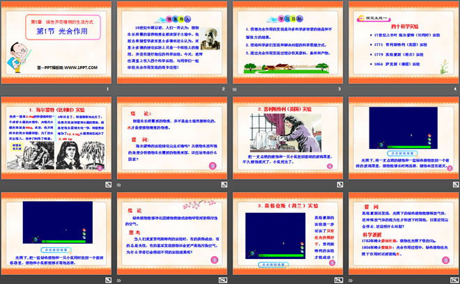 18世纪中期以前,人们一直认为:植物生长所需的营养物质全都来源于土壤中。包括古希腊哲学家亚里士多德也这么认为。亚里士多德的结论实际上只是一个经验上的推测,并没有进行相应的科学实验。今天,老师在课堂上引入四个科学实验,与同学们一起体验光合作用发现的艰辛过程!