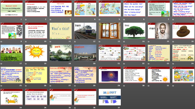 关键词:《The cows are drinking water》教学课件,外研版三起点六年级下册英语课件,六年级英语幻灯片课件下载,《The cows are drinking water》PPT课件下载,.ppt格式