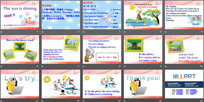 关键词:《The sun is shining》教学课件,外研版三起点六年级下册英语课件,六年级英语幻灯片课件下载,《The sun is shining》PPT课件下载,.ppt格式