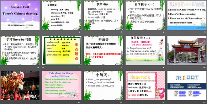 关键词:《There's Chinese dancing》教学课件,外研版三起点六年级上册英语课件,六年级英语幻灯片课件下载,《There's Chinese dancing》PPT课件下载,.ppt格式