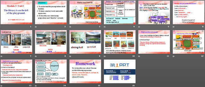 关键词:《The library is on the left of the playground》教学课件,外研版七年级上册英语课件,七年级英语幻灯片课件下载,《The library is on the left of the playground》PPT课件下载,.ppt格式