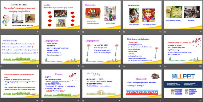 关键词:《My mother's cleaning our house and sweeping away bad luck》教学课件,外研版七年级上册英语课件,七年级英语幻灯片课件下载,《My mother's cleaning our house and sweeping away bad luck》PPT课件下载,.ppt格式