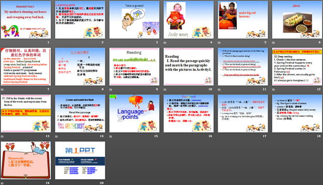 关键词:《My mother's cleaning our house and sweeping away bad luck》教学课件,外研版七年级上册英语课件,七年级英语幻灯片课件下载,《My mother's cleaning our house and sweeping away bad luck》PPT课件下载,.ppt格式