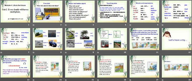 关键词:《Every family will have a small plane》教学课件,外研版七年级下册英语课件,七年级英语幻灯片课件下载,《Every family will have a small plane》PPT课件下载,.ppt格式