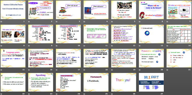 关键词:《Everyone will study at home》教学课件,外研版七年级下册英语课件,七年级英语幻灯片课件下载,《Everyone will study at home》PPT课件下载,.ppt格式