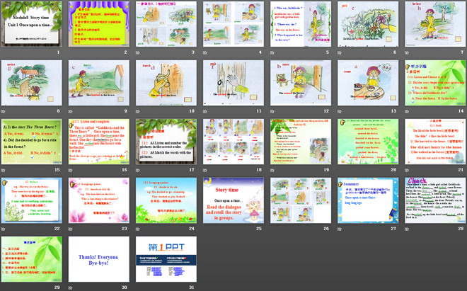 今天,我们学习了一个童话故事<The goldilocks>故事的开头我们一般用