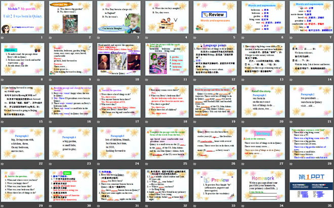 关键词:《I was born in Quincy》教学课件,外研版七年级下册英语课件,七年级英语幻灯片课件下载,《I was born in Quincy》PPT课件下载,.ppt格式