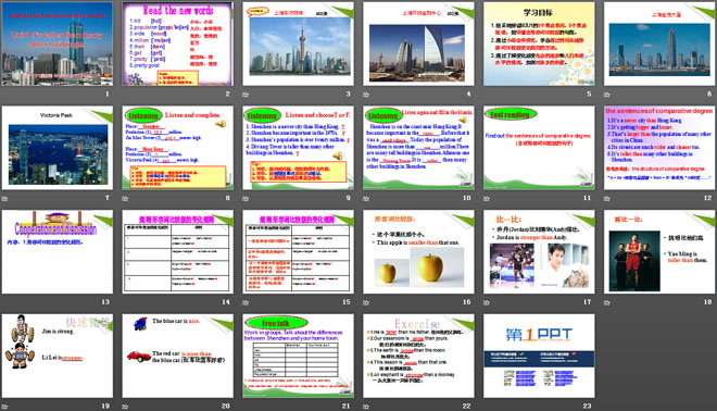 1.能正确拼读M2U1的8个重点单词、8个重点短语,能听懂含形容词比较级的句型。
