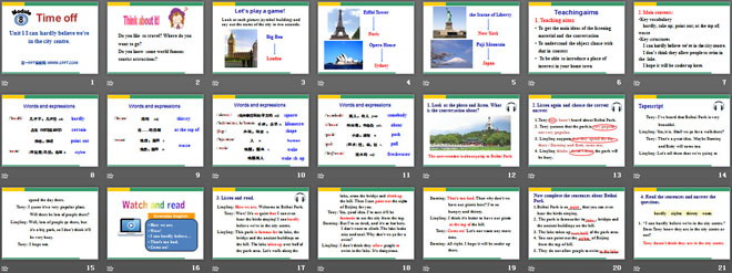 关键词:《I can hardly believe we're in the city center》教学课件,外研版八年级下册英语课件,八年级英语幻灯片课件下载,《I can hardly believe we're in the city center》PPT课件下载,.ppt格式