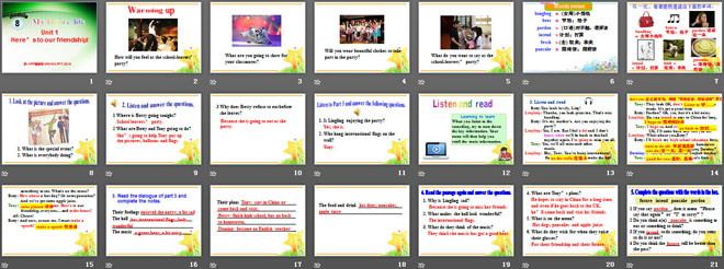 关键词:《Here's to our friendship》教学课件,外研版九年级下册英语课件,九年级英语幻灯片课件下载,《Here's to our friendship》PPT课件下载,.ppt格式