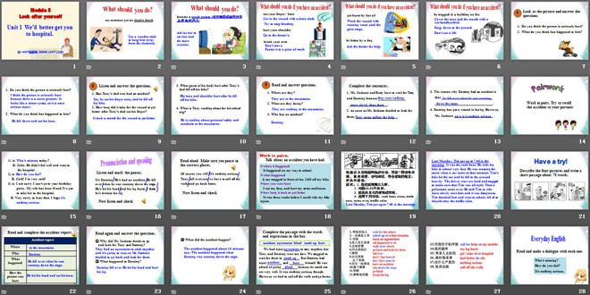 关键词:《We'd better get you to hospital》教学课件,外研版九年级下册英语课件,九年级英语幻灯片课件下载,《We'd better get you to hospital》PPT课件下载,.ppt格式