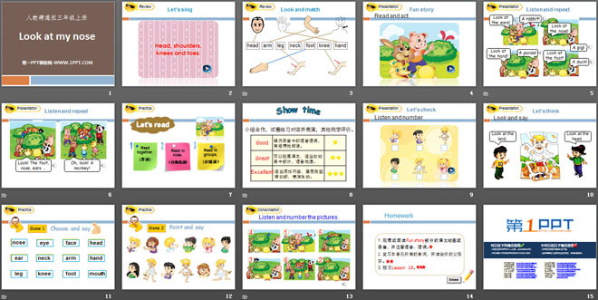 关键词:《Look at my nose》教学课件,人教精通版三年级上册英语PPT课件下载,三年级英语幻灯片课件下载,《Look at my nose》PPT课件下载,.PPT格式;