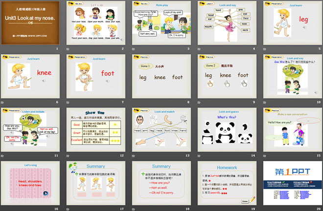 关键词:《Look at my nose》教学课件,人教精通版三年级上册英语PPT课件下载,三年级英语幻灯片课件下载,《Look at my nose》PPT课件下载,.PPT格式;