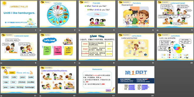 关键词:《I like hamburgers》教学课件,人教精通版三年级上册英语PPT课件下载,三年级英语幻灯片课件下载,《I like hamburgers》PPT课件下载,.PPT格式;
