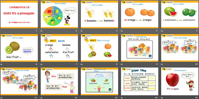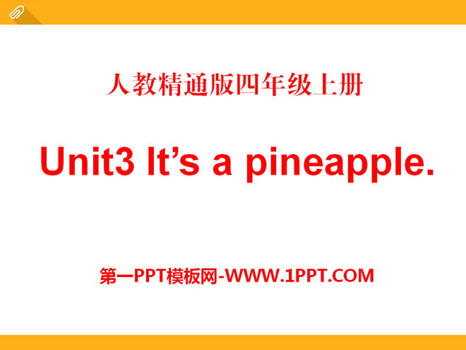 关键词:《It's a pineapple》教学课件,人教精通版四年级上册英语PPT课件下载,四年级英语幻灯片课件下载,《It's a pineapple》PPT课件下载,.PPT格式;