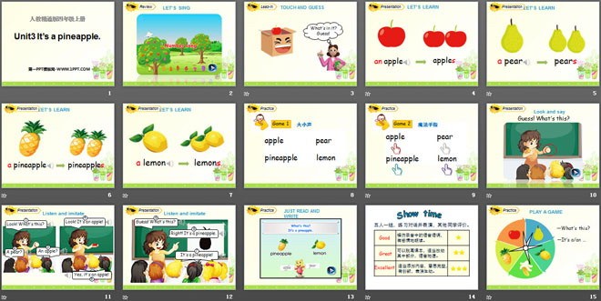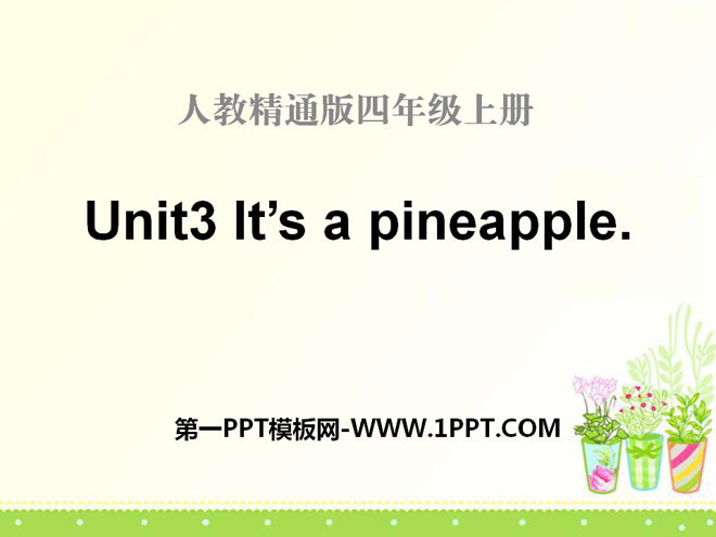 关键词:《It's a pineapple》教学课件,人教精通版四年级上册英语PPT课件下载,四年级英语幻灯片课件下载,《It's a pineapple》PPT课件下载,.PPT格式;