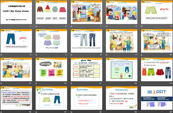 关键词:《I like those shoes》教学课件,人教精通版四年级上册英语PPT课件下载,四年级英语幻灯片课件下载,《I like those shoes》PPT课件下载,.PPT格式;